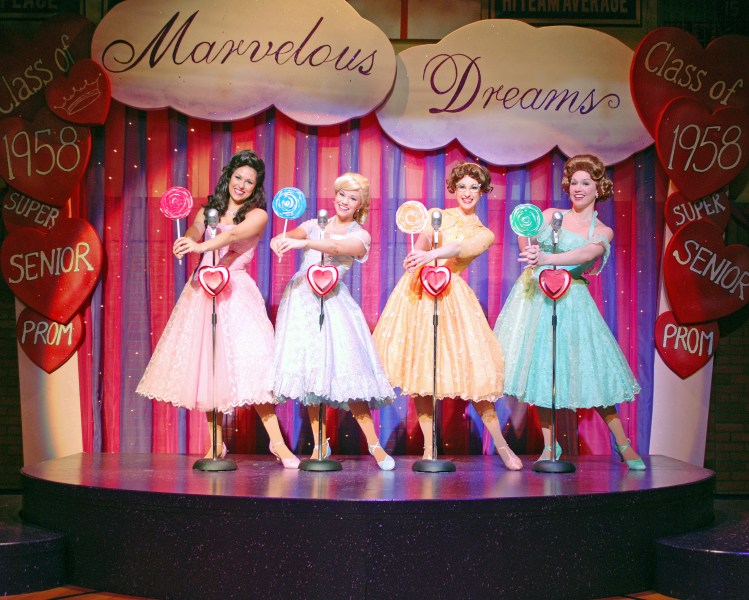 The first half of the production takes place in 1958, the second half a decade later. The girls sing popular songs of the 50’s and early 60’s, tell their stories, complain about prom rituals, and eventually growing up. There isn’t much serious here to ponder (not that there isn’t a moment or two of pathos, especially in the later goings of the second act when the girls bicker about boyfriends, marriages, and possible divorces). But basically this is just fun. It’s amusement-park entertainment taken to a much more professional level. It borrows generously from twenty other musicals, movies, and even glee club.