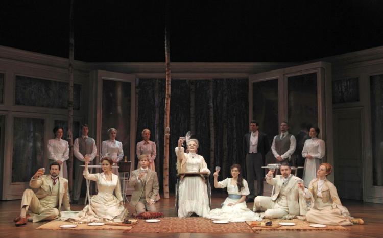 What can’t be overlooked is a production that has a horrible production design, music that is slowed-down in tempo to the point of a dirge, and such murky lighting that for long sections of ensemble you watch shapes move about in the near dark. The opening waltz with all characters mingling and intermingling with their partners is murky to the point that you can’t even recognize who is who. Sloppy, dark, and dreary. When we finally arrive in the country for Act II, you are still staring at the same dusty-mirrored drawing room walls. Might as well have stayed in the city.