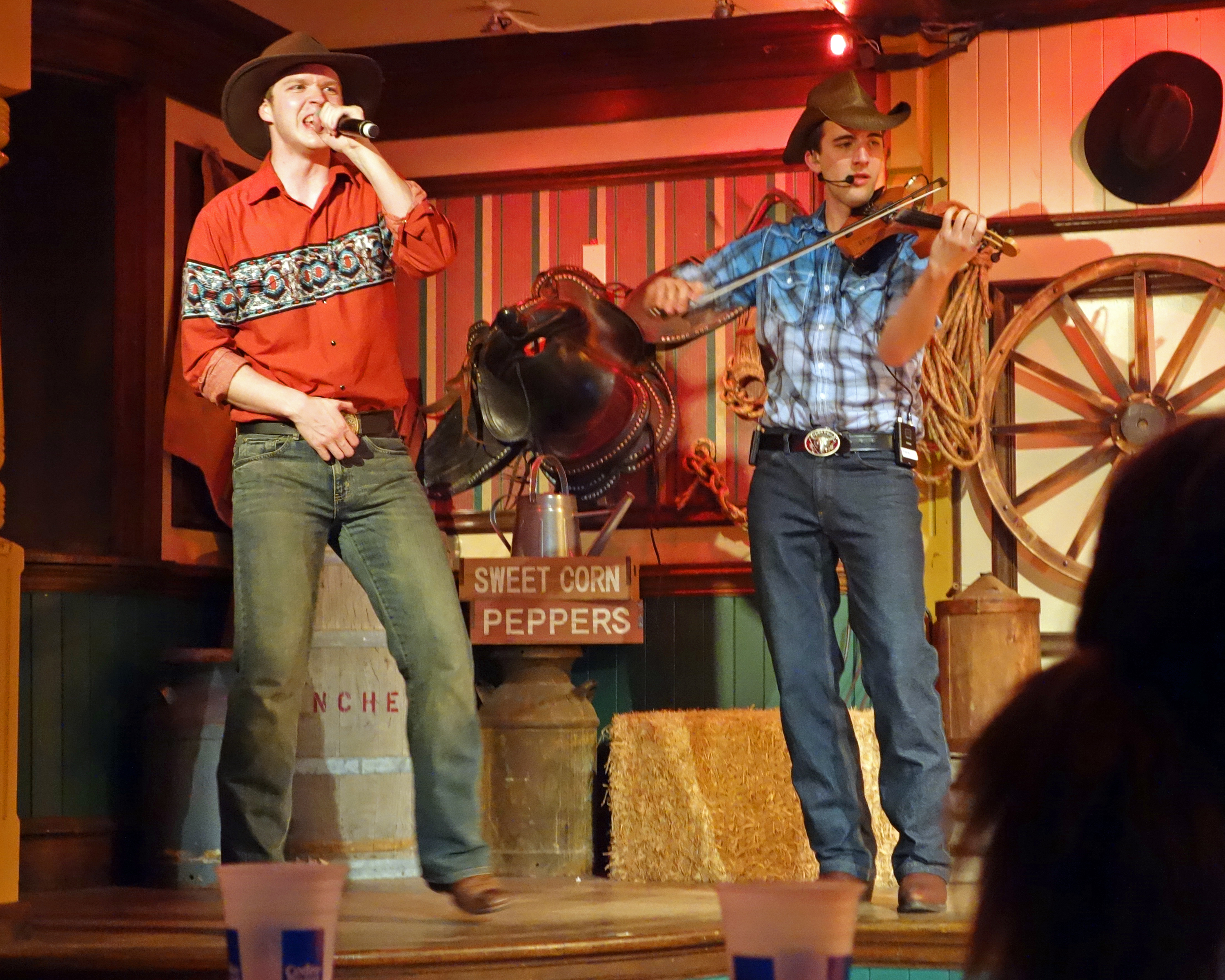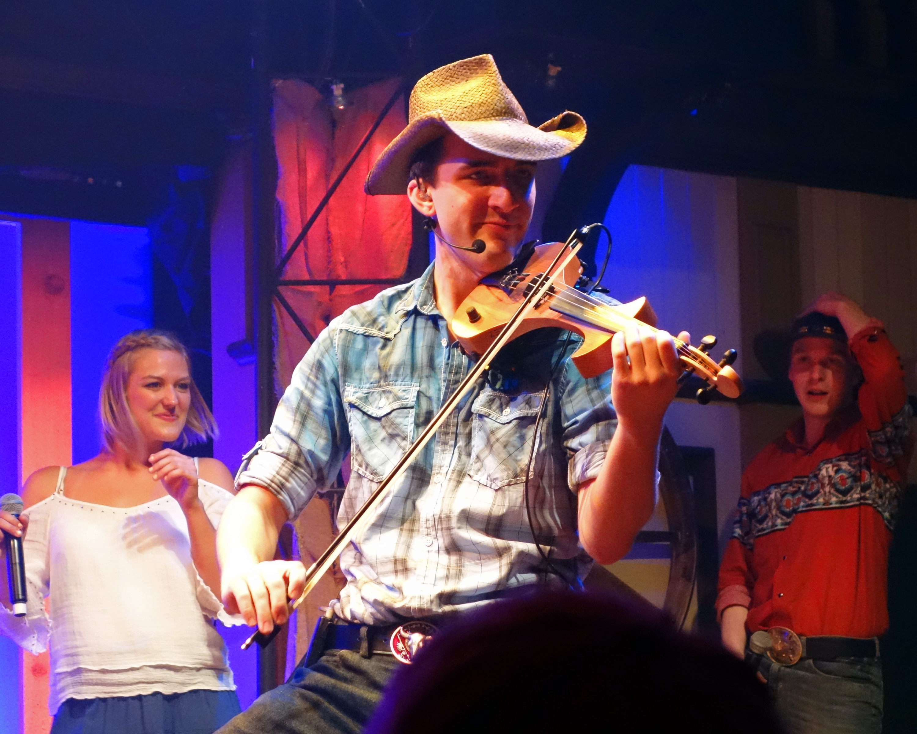 Down the Frontier Trail, Rockin’ Country is the newest show at the Red Garter Saloon. Its a mish-mash of country pop tunes, none of which are memorable nor would you have ever heard them unless you listen to exclusively country stations. The cast here is excellent, with a great guitarist, percussionist, and gitfiddle player that play live to a recorded track. Vocals are strong, and they are at their best when the track drops out every now and again so you can actually hear them. The problem here, as has been the past three summers, is the horrendous sound system — the track is far too loud, causing the live musicians to play even louder, and leaving the vocalists shouting to be heard — the result, the vocals are incomprehensible mush…all of which could be solved with proper sound levels. But they are definitely going for the “loud rock sound” here, and its a failure. You’ll leave the teensy Red Garter with your ears ringing. It bears repeating that the cast here is very strong, its too bad they are handed such poor sound equipment to work with. Here’s a glimpse of what’s going on there: