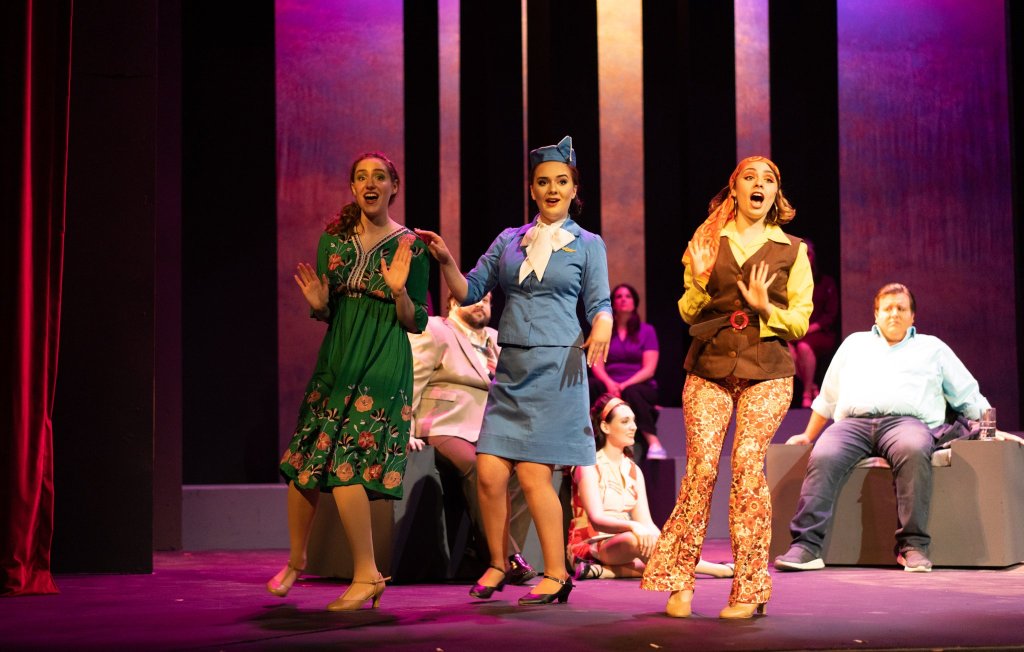 But it’s the women in Bobby’s life that make this production soar — and I mean soar. Take, for example, Leah Fox who turns in the evening’s funniest performance as marriage-shy personally neurotic Amy in “Getting Married Today”. It’s the strongest performance I have seen from her already strong career in musical theater. And then there is Julia Hoffert as karate-wielding, “I can’t I’m on a diet” Sarah whose vocals and physical shtick shine throughout the evening (watch her delighfully munching on brownies in the background at times). Maya Gangadharan turns in a masterful performance as Joanne, and her “Ladies Who Lunch” is spot-on perfect. Lauren Goyer is delighful as flight attendant April (whom Bobby occasionally calls May, or June).