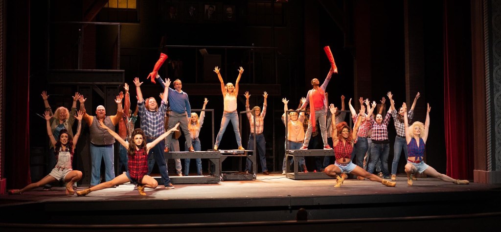 I have no other KB production to compare this one to, but I’m very pleased my first experience was at the Croswell. Those who have seen a previous production already knew what a joyful experience it would be; you could feel the electricity in the audience even before the curtain went up. The entire cast was so fully invested in their characters, including British accents, that I was somewhat transported. Director/Choreographer Debra Ross Calabrese, Conductor Adam P. Miller and the entire creative team presented a tight production; every note, entrance, step, and look had meaning, from the beautiful opening harmonies to the final exuberant number. Scenic Designer Doug Miller created a [dare I say] “soleful” factory set with so much depth that, along with the lighting (designed by Crosby Slupe) and the detailed set dressing, the audience could feel the importance and weight the factory carries in the townsfolk livelihood. Then the factory transforms into a glittering stage show in seconds, with a colorful boost from Costume Designer Tallie Carter.