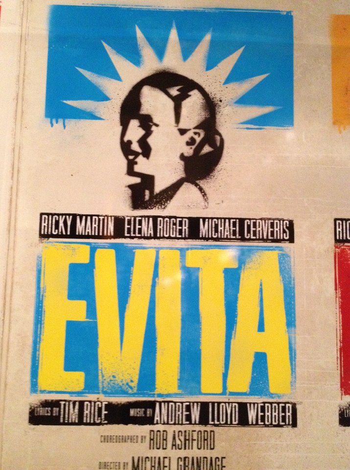 EVITA returns in a glamorous production at the Marquis Theatre. The star here is Elena Roger, Argentinian actress recreating her role from the West End (2006). But the obvious ticket-selling draw is Ricky Martin, judging by the audience reaction and age.